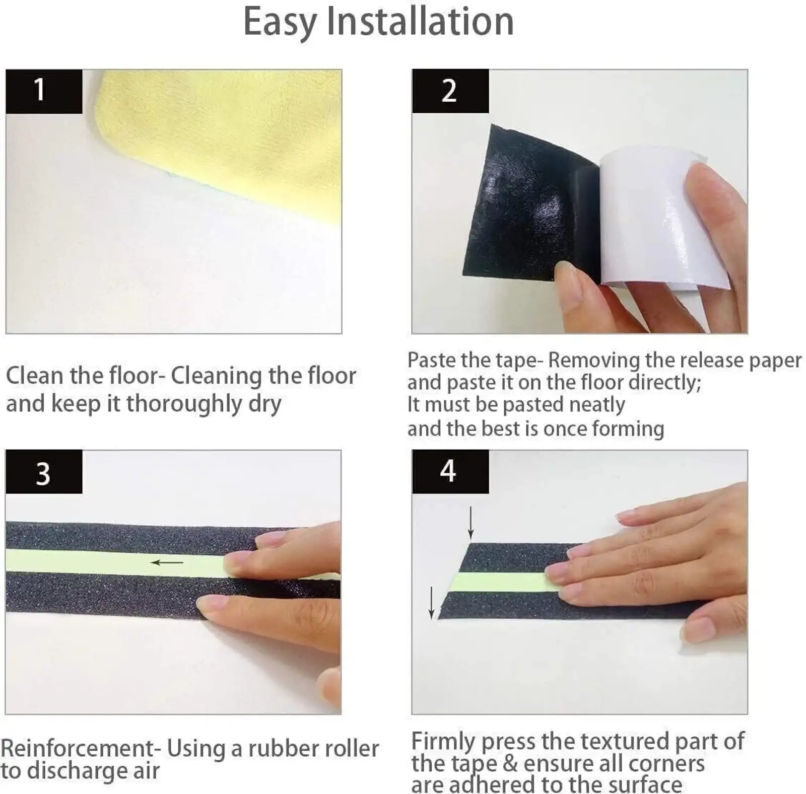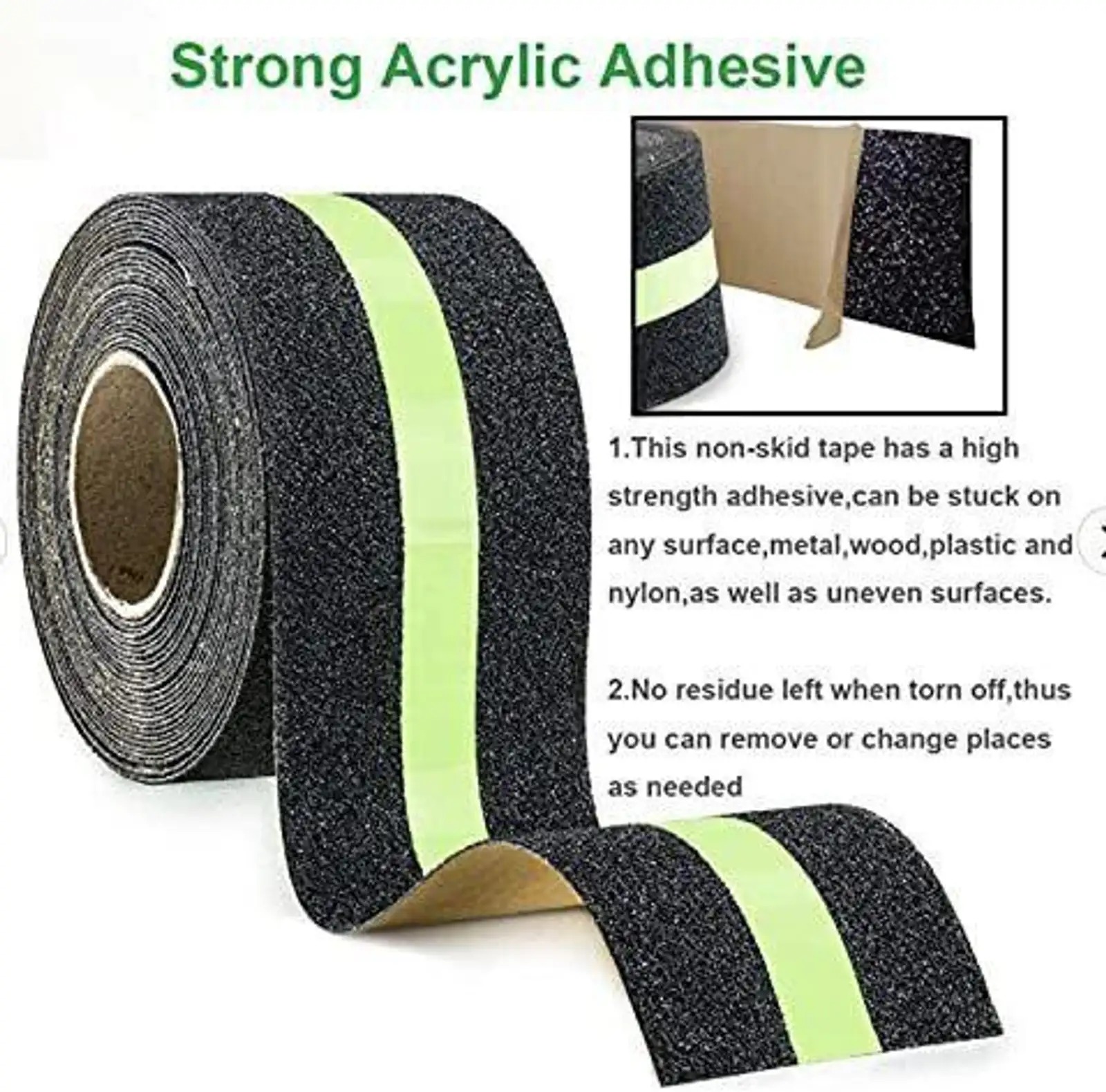 Ensure safety day and night with this premium Glow-in-the-Dark Anti-Slip Tape. Designed with a high-traction surface and a bright luminous strip, this tape provides excellent grip in both indoor and outdoor areas. The self-adhesive backing makes installation quick and easy on stairs, ladders, walkways, ramps, or any slippery surface. Its black-green color offers high visibility, while the waterproof and weather-resistant material ensures long-lasting durability. Key Features: Glow-in-the-dark green strip for night visibility Strong anti-slip texture for maximum safety Self-adhesive & easy to apply Weatherproof and water-resistant Ideal for stairs, ladders, walkways, and outdoor steps